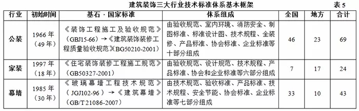 建筑裝飾行業(yè)歷經(jīng)49年、特別是改革開放37年來(lái)的努力,與住建部的“工程建設(shè)標(biāo)準(zhǔn)體系”相協(xié)調(diào),建筑裝飾三大行業(yè)技術(shù)標(biāo)準(zhǔn)體系基本框架基本形成,現(xiàn)有技術(shù)標(biāo)準(zhǔn)136項(xiàng),其中全國(guó)的86項(xiàng)、地方的50項(xiàng),國(guó)家標(biāo)準(zhǔn)6項(xiàng)。包括住建部批準(zhǔn)的行業(yè)標(biāo)準(zhǔn),如2013年6月9日《住宅室內(nèi)裝飾裝修工程質(zhì)量驗(yàn)收規(guī)范》(JGJ/T304-2013)、2015年6月3日《住宅室內(nèi)裝飾裝修設(shè)計(jì)規(guī)范》(JGJ367-2015)等。