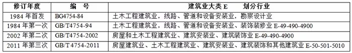 第一次修訂:1994年國(guó)家統(tǒng)計(jì)局頒發(fā)國(guó)家標(biāo)準(zhǔn)《國(guó)民經(jīng)濟(jì)行業(yè)分類與代碼》(GB/T4754-94),代替BG4754-84,將原建筑業(yè)門類中的土木工程建筑業(yè),線路、管道和設(shè)備安裝業(yè),勘察設(shè)計(jì)業(yè),調(diào)整為土木工程建筑業(yè),線路、管道和設(shè)備安裝業(yè)、裝飾裝修業(yè)三大行業(yè)。