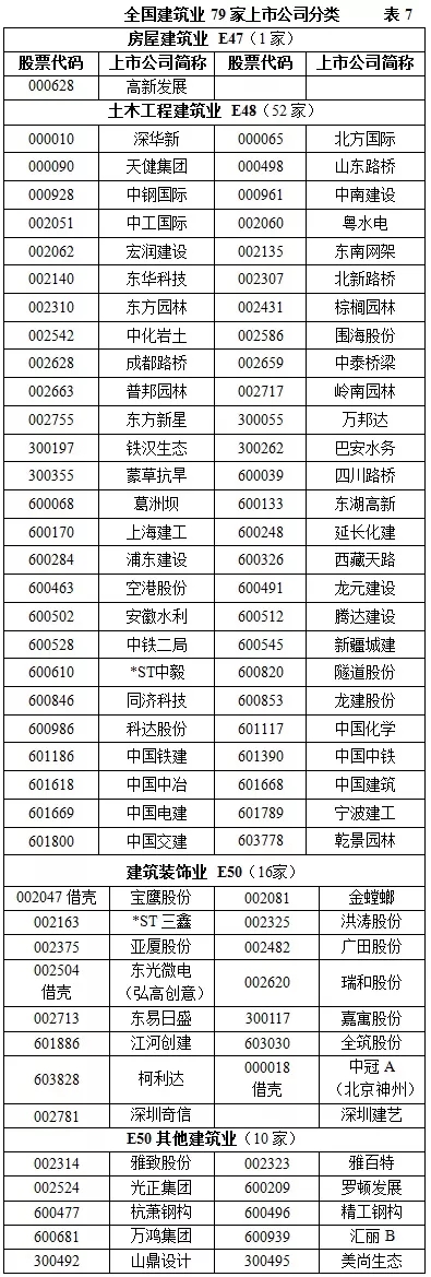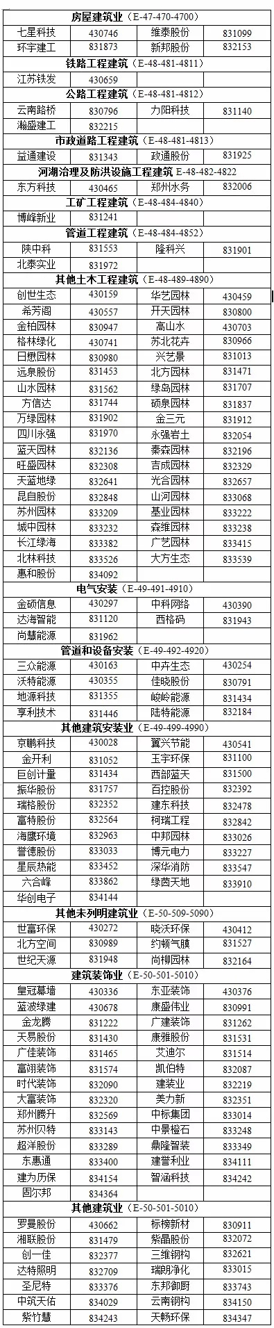 全國(guó)建筑業(yè)134家新三板掛牌公司分類名稱、代碼和數(shù)量 表9
