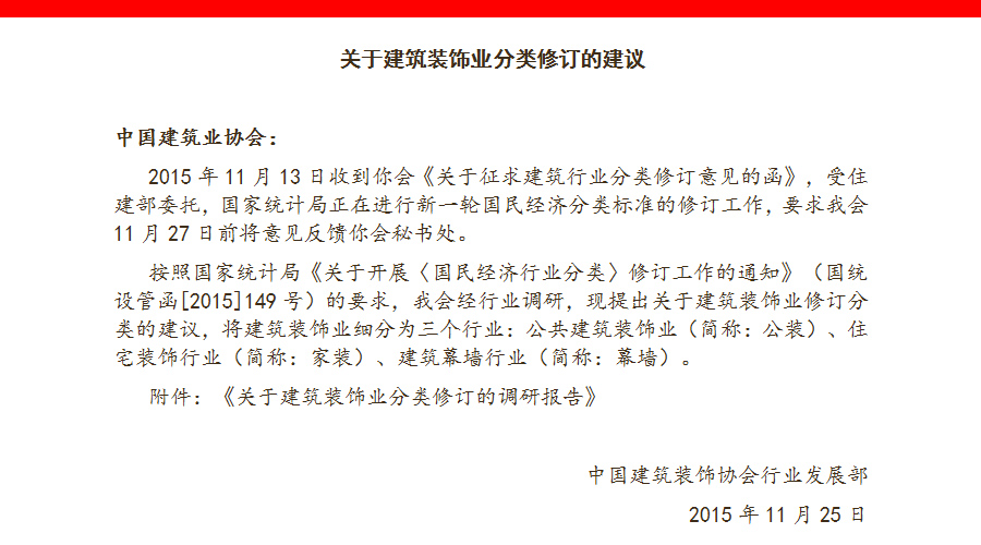 中國(guó)建筑裝飾協(xié)會(huì)參與了《國(guó)民經(jīng)濟(jì)行業(yè)分類》標(biāo)準(zhǔn)的修訂工作。根據(jù)2015年10月21日國(guó)家統(tǒng)計(jì)局《關(guān)于開展〈國(guó)民經(jīng)濟(jì)行業(yè)分類〉修訂工作的通知》(國(guó)統(tǒng)設(shè)管函[2015]149號(hào))的要求,受住建部委托,中國(guó)建筑業(yè)協(xié)會(huì)2015年11月13日發(fā)出了《關(guān)于征求建筑行業(yè)分類修訂意見的函》,中國(guó)建筑裝飾協(xié)會(huì)時(shí)任行業(yè)發(fā)展部主任黃白具體參與了修訂工作。