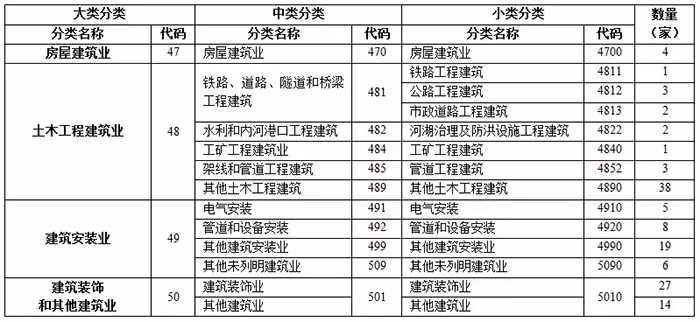 建筑業(yè)134家占全國(guó)新三板4034家的3.2%,裝飾行業(yè)27家占建筑業(yè)的20%。建筑業(yè)門類分類代碼E,大、中、小分類名稱和代碼的統(tǒng)計(jì)如下表。