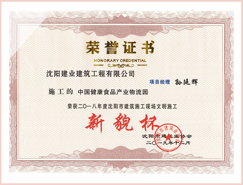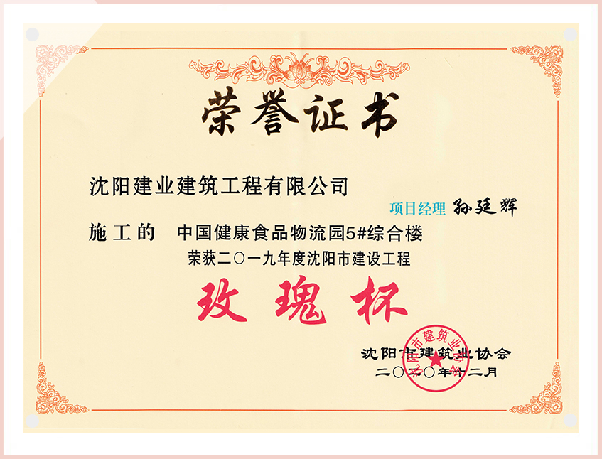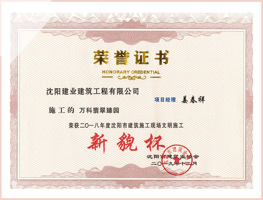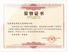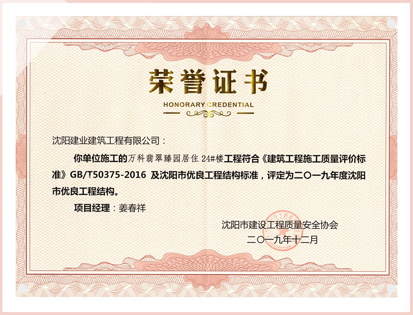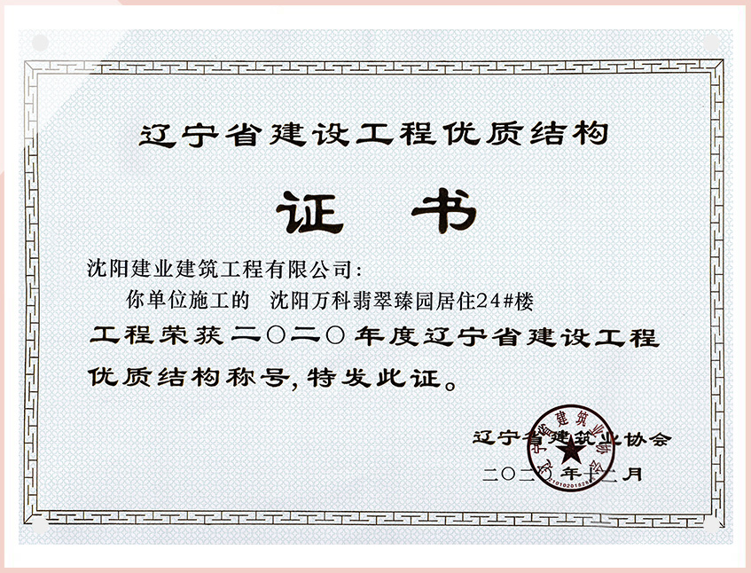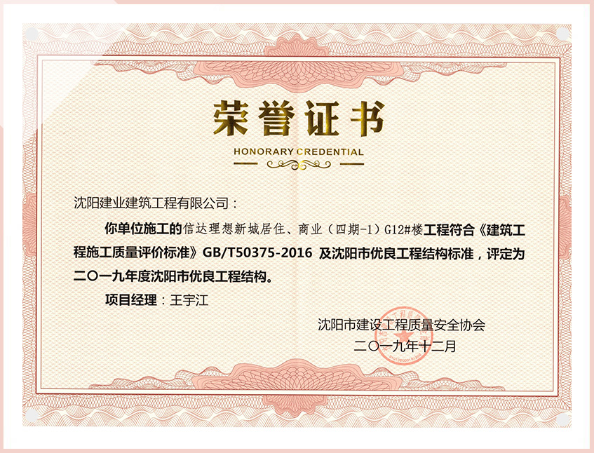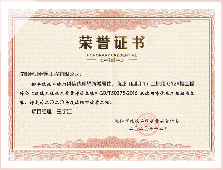 工程質(zhì)量多次進(jìn)入遼寧省前十名,其中多個(gè)項(xiàng)目獲得“遼寧省優(yōu)質(zhì)結(jié)構(gòu)”、“沈陽(yáng)市優(yōu)質(zhì)結(jié)構(gòu)”、“沈陽(yáng)市優(yōu)良工程”、“新貌杯”、“玫瑰杯”、“沈長(zhǎng)哈三市優(yōu)質(zhì)金杯獎(jiǎng)”、“沈陽(yáng)市民營(yíng)企業(yè)規(guī)模百?gòu)?qiáng)”、“沈陽(yáng)市模范勞動(dòng)關(guān)系和諧企業(yè)”、“沈陽(yáng)市先進(jìn)施工單位”等多項(xiàng)獎(jiǎng)項(xiàng)。
